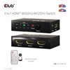Club 3D CSV-1381 on 3:1 HDMI™ -standardin mukainen. kytkin, joka reitittää teräväpiirtovideon ja digitaalisen äänen mistä tahansa HDMI™-tulosta 8K60Hz/4K120Hz HDMI™-lähtöön.