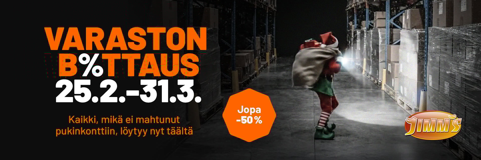 Kaikki, mikä ei mahtunut pukinkonttiin, löytyy nyt Jimm´sin Varaston boottauksesta! Parasta pelaamiseen, koneen rakentamiseen ja elämästä nauttimiseen jopa –50 %! Jos et saanut jouluna, saat nyt suoraan Turun varastolta!