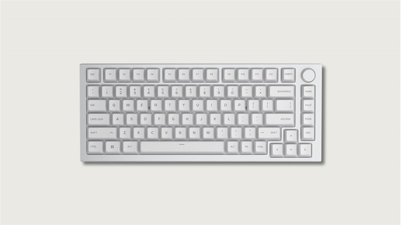Näppäinhattusarja värissä Arctic White, 115 PBT-muovista näppäinhattua, läpinäkymätön kulutuskestävällä merkistöllä.