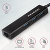 Ohut metallinen USB-C 3.2 Gen1 (USB 3.0) -moniporttikeskus AXAGON HMC-GL3A yhdistää jopa kolme USB-laitetta kannettavaan tietokoneeseen tai tietokoneeseen ja lisää myös Gigabit-verkkokortin, joka yhdistää tietokoneen nopeaan verkkoon.