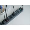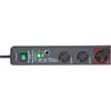 Power strip with illuminated safety switch for switching on and off (two-pole) and one function control light each for overvoltage protection and follow sockets