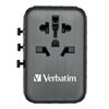 - Verbatim UTA-05 GaN III Universal Travel Adapter, jossa 2x USB-C PD 65W & QC 4+ / 2 x USB-A