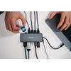 USB-C PD (Power Delivery) -portti tarjoaa keskeytyksettömän läpivientilatausmahdollisuuden. Joissakin kannettavissa tietokoneissa on vain yksi USB-C-portti, joten kun olet lisännyt hubin, ei ole ylimääräistä porttia virran kytkemistä varten. Pro Multiport -hubin USB-C-portti mahdollistaa läpivirtaavan latauksen virtalähteestä, jolloin kannettava tietokone voidaan ladata jopa 85 W teholla (15 W varattu muille porteille) samalla, kun kaikkia muita hubin portteja käytetään.