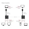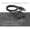 DisplayPort 2-in-1 kaksisuuntainen kytkin 8K:lle, se voi vaihtaa jommankumman lähteen yhdelle näyttölle tai vaihtaa yhden lähteen jompaankumpaan kahdesta näyttöstä.