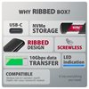Alumiininen ulkoinen AXAGON EEM2-SC RIBBED -kotelo, jossa on 10 Gbps USB-liitäntä ja joka on suunniteltu M.2 NVMe SSD -asemille. Käännettävä USB-C-liitin takaa vakaan ja nopean yhteyden. Pakkauksessa on USB-C –> USB-C-kaapeli, jolla kotelo liitetään tietokoneeseen.