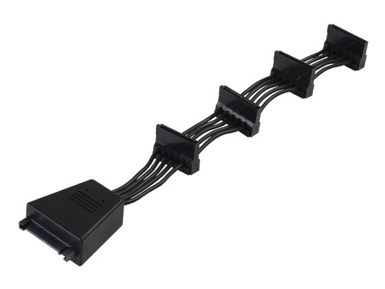 Silverstonen virtajakojohto, jossa on integroituna kaksi kondensaattoria virransaannin varmistamiseksi! Jakaa yhden SATA-virtaliitännän neljäksi, johtojen välit 60mm + 43mm + 43mm + 43mm.